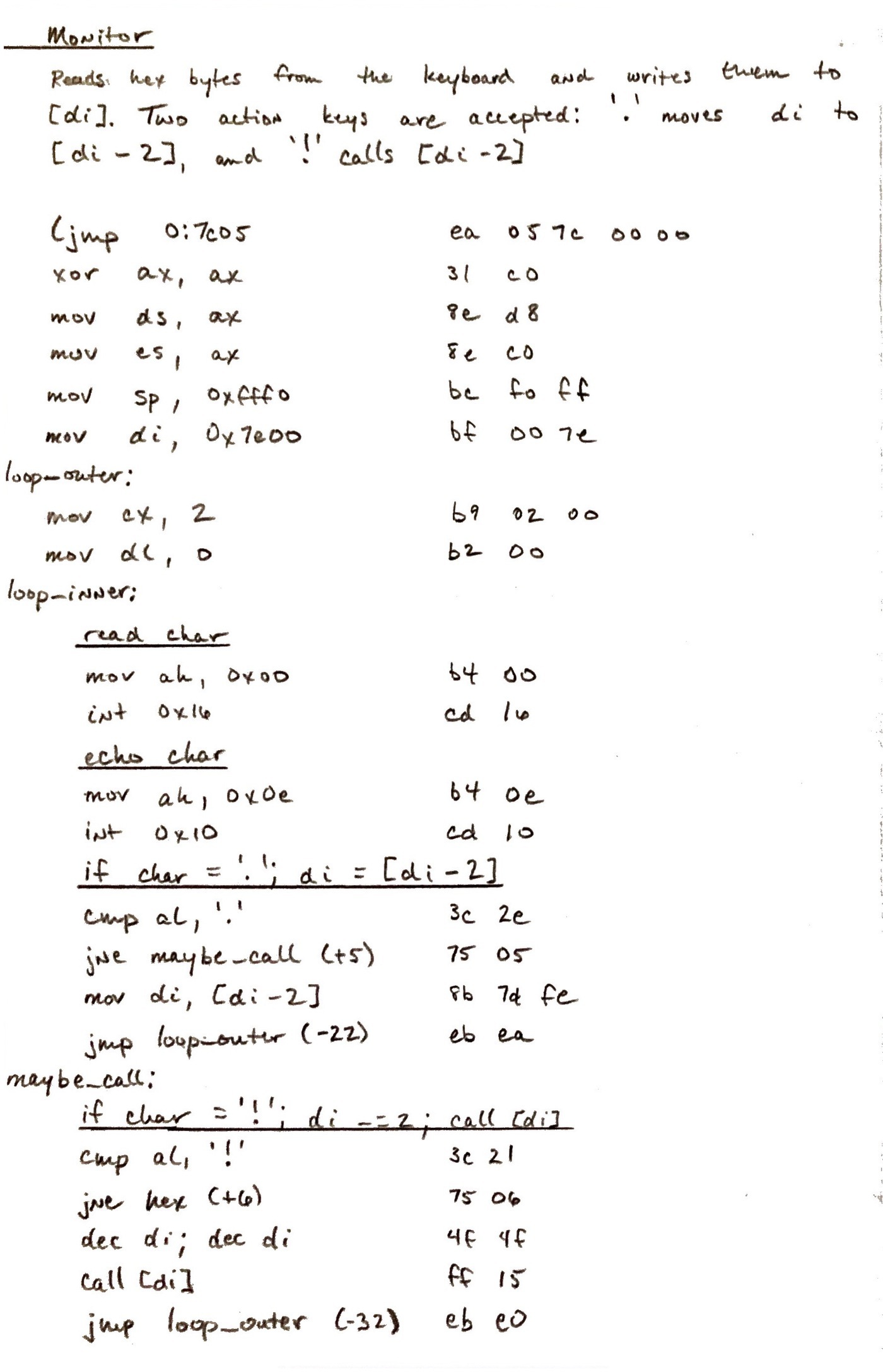 First, we need a way to get any data at all into memory, so it can be executed. A monitor program is placed in the boot sector so that is executes on boot. We'll skip hand-emulated SATA for now.