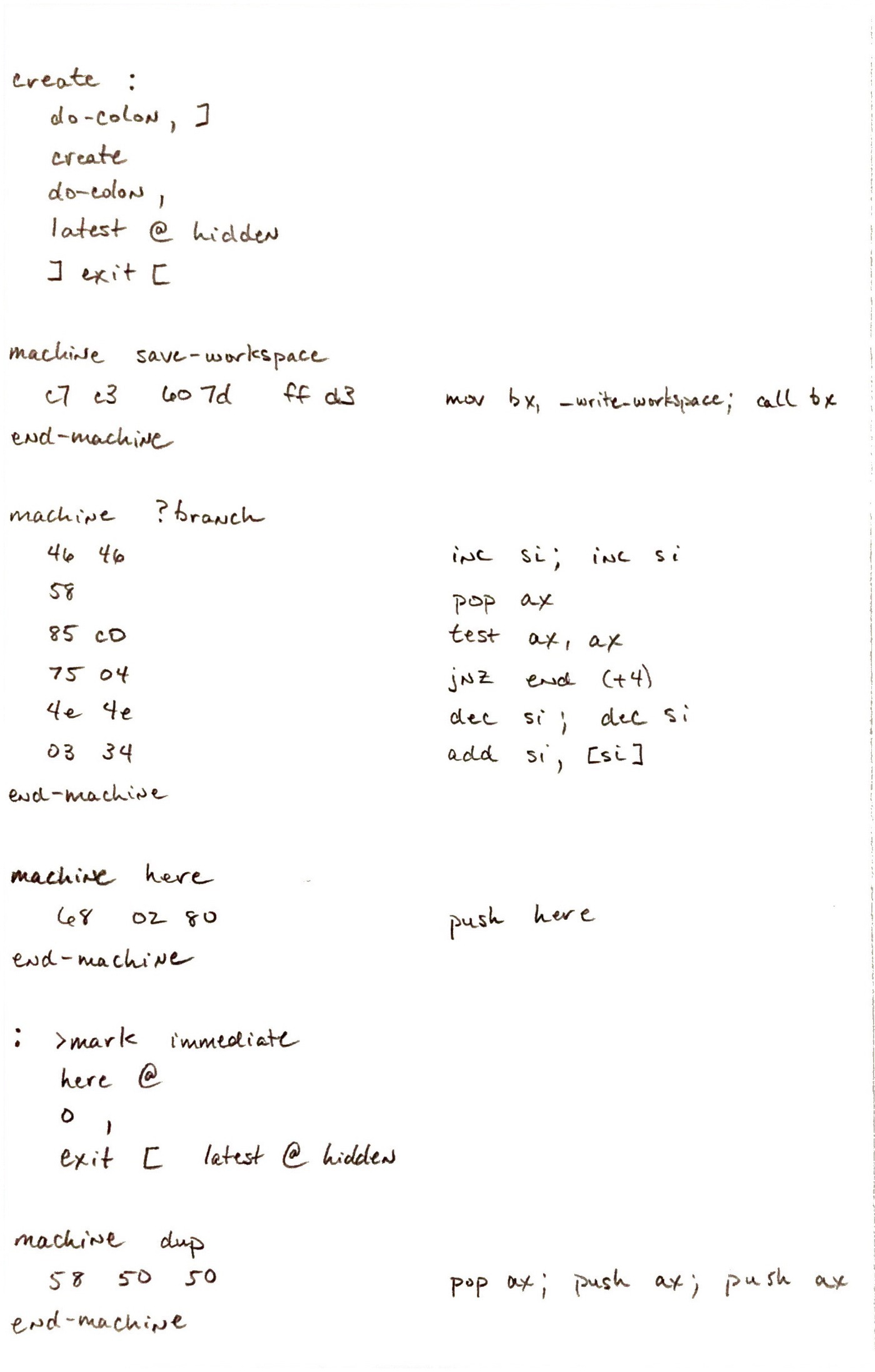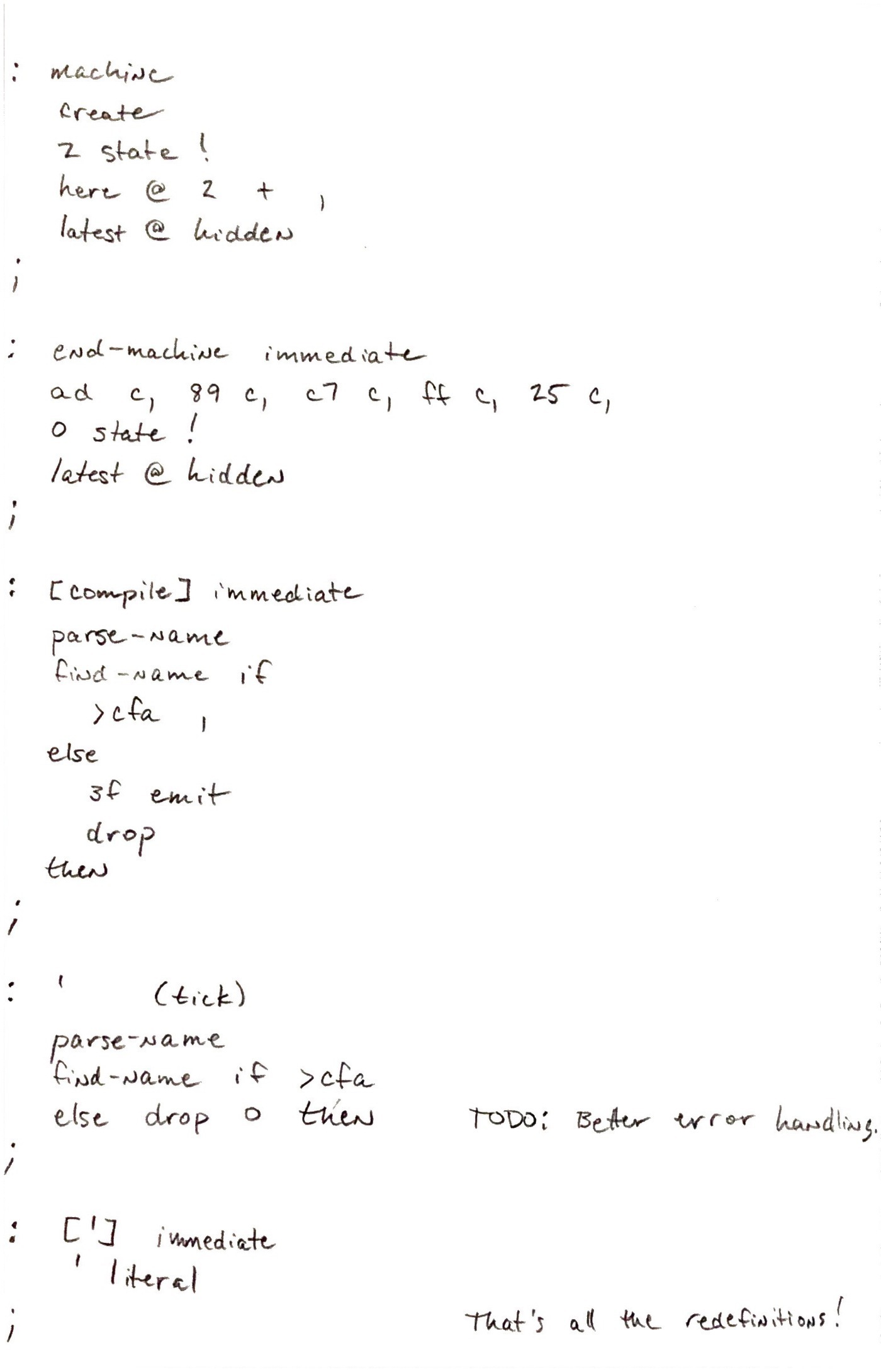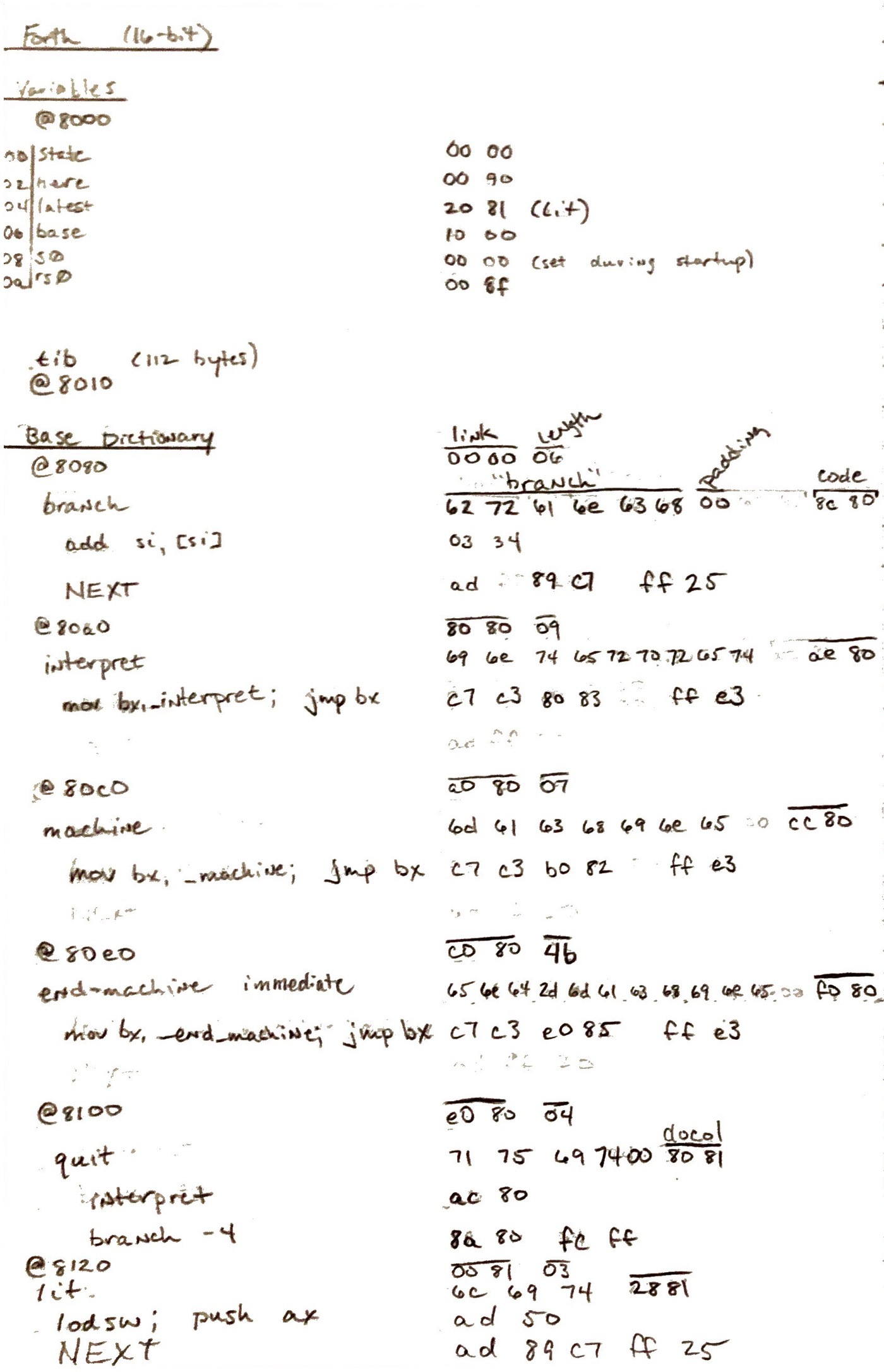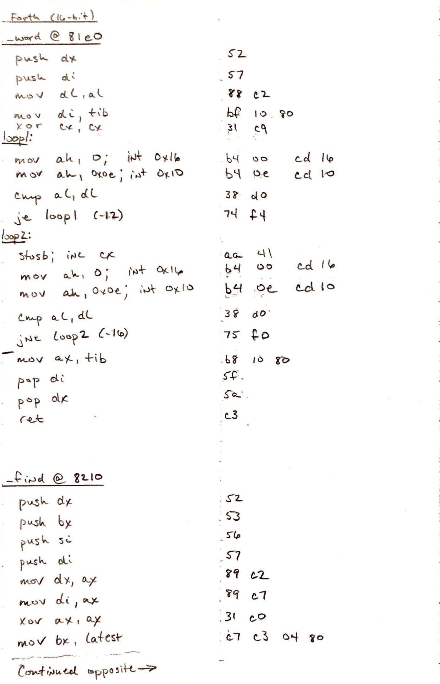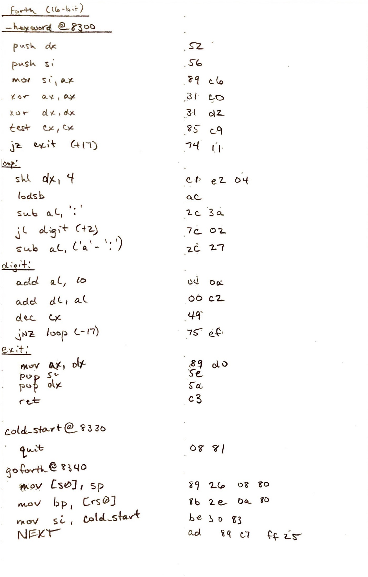 Writing out assembly by hand, translating it to hex, and keying it without mistakes is tedious and awful. So, as soon as possible, it would be nice to work at a higher level of abstraction. FORTH is a good candidate for several reasons: it's easy to parse, straighforward to bridge with native code, and—crucially—suitable for bootstrapping itself.