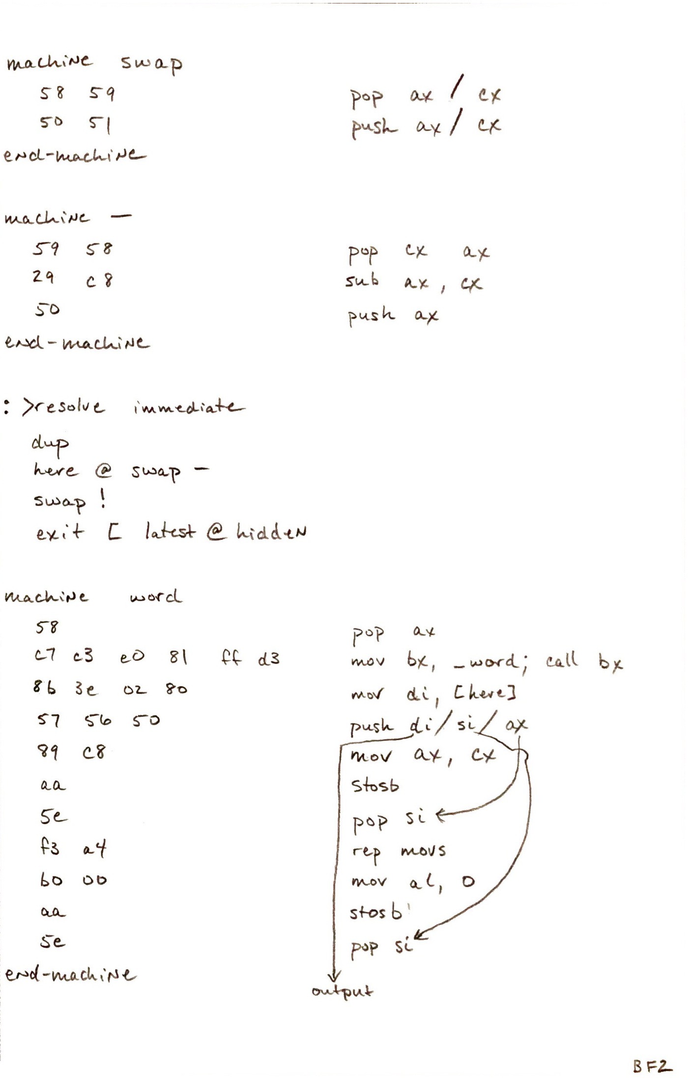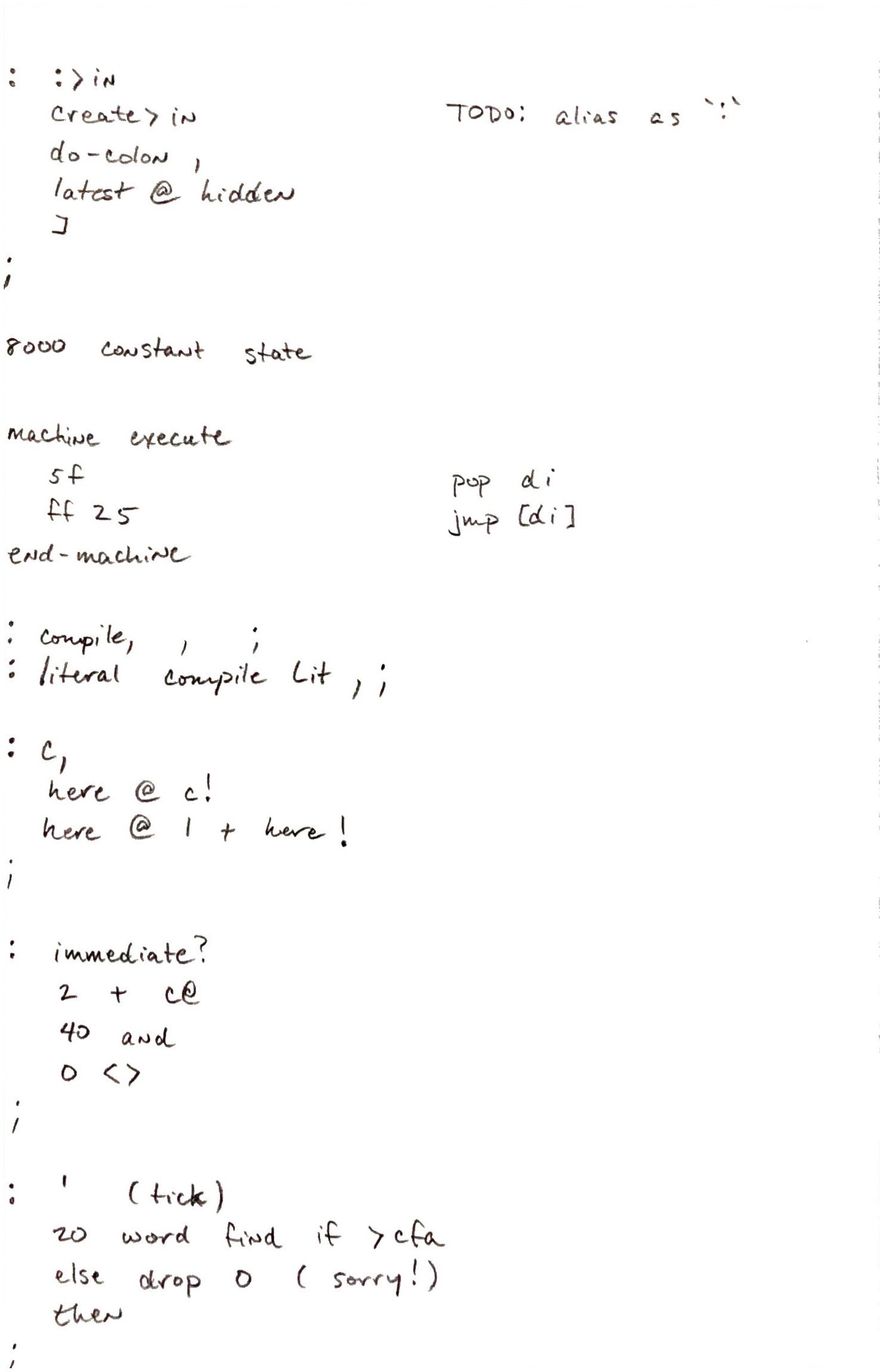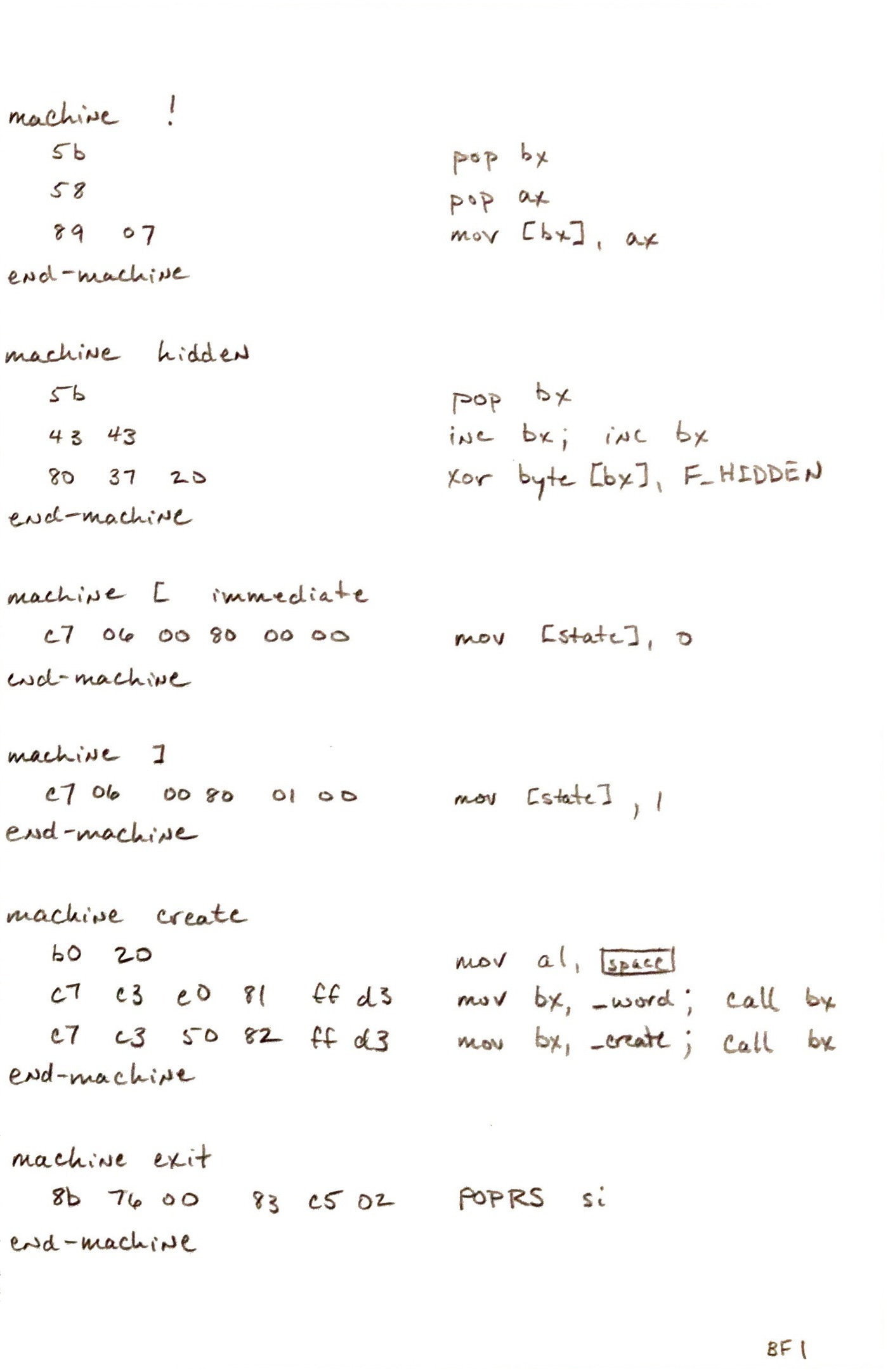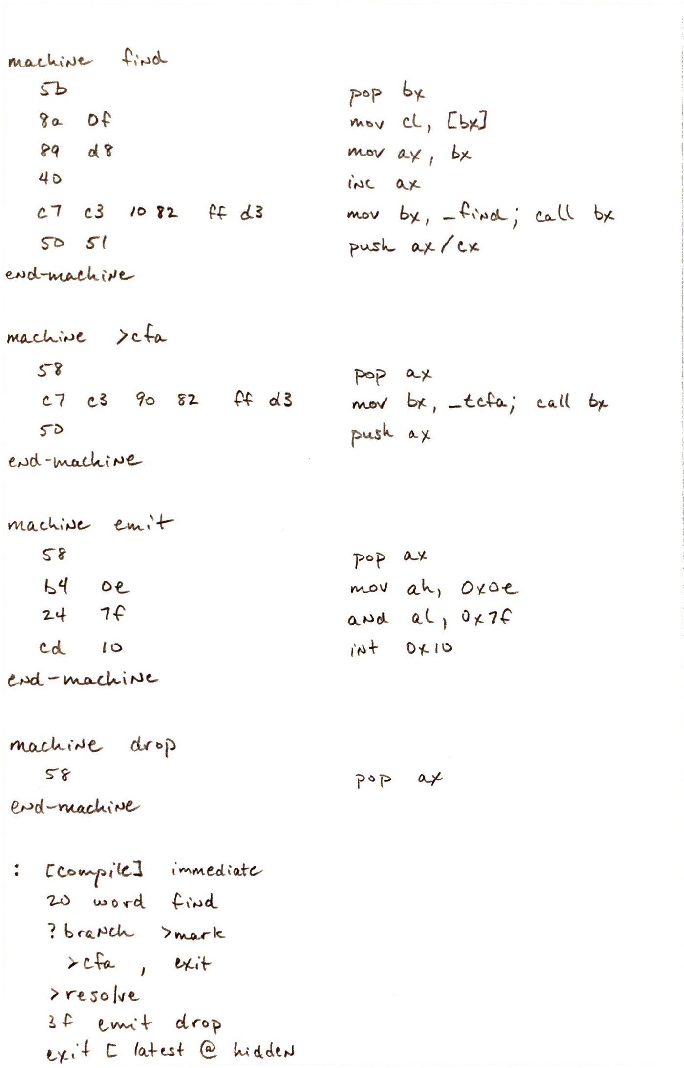 Writing out assembly by hand, translating it to hex, and keying it without mistakes is tedious and awful. So, as soon as possible, it would be nice to work at a higher level of abstraction. FORTH is a good candidate for several reasons: it's easy to parse, straighforward to bridge with native code, and—crucially—suitable for bootstrapping itself.