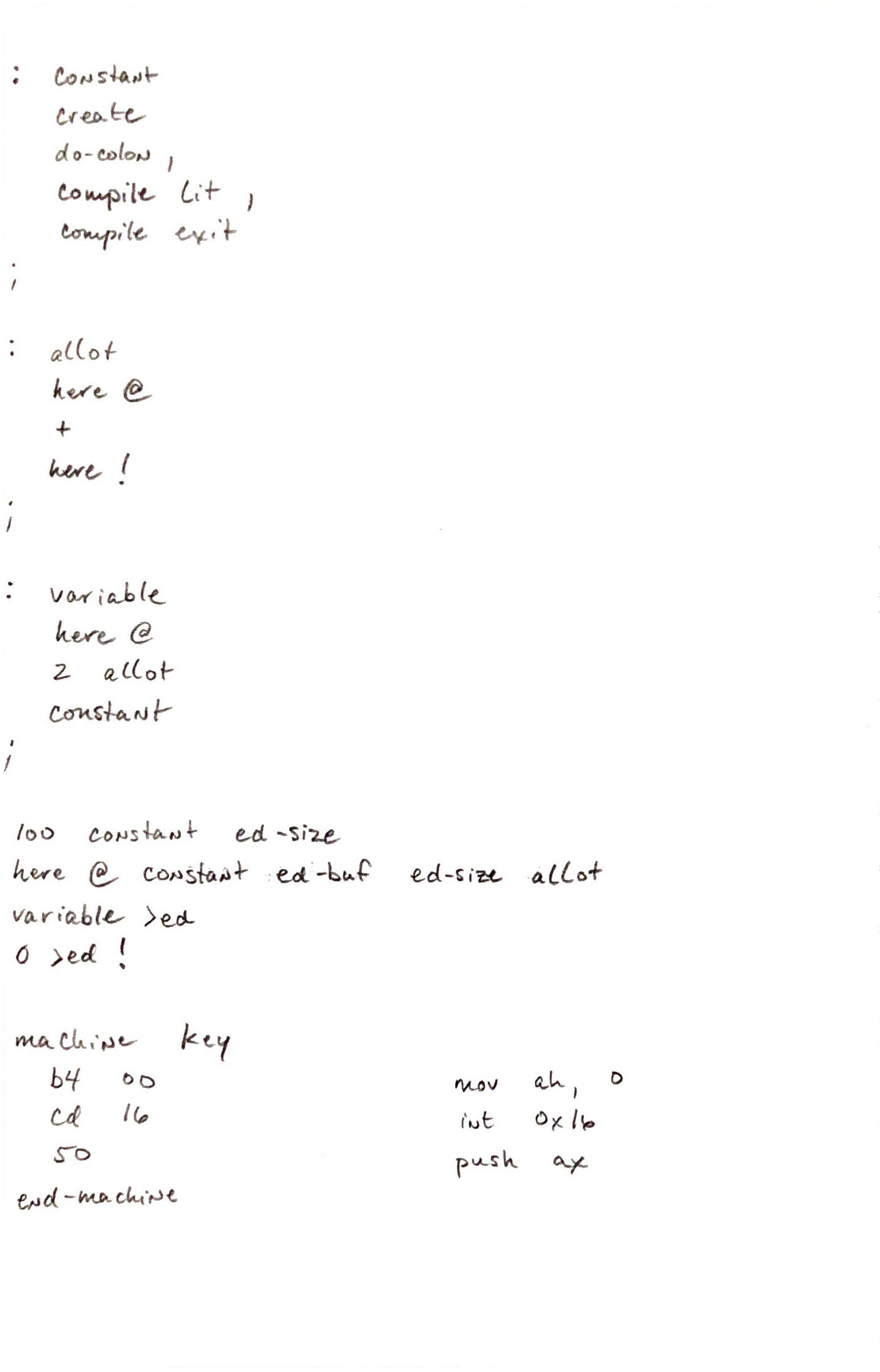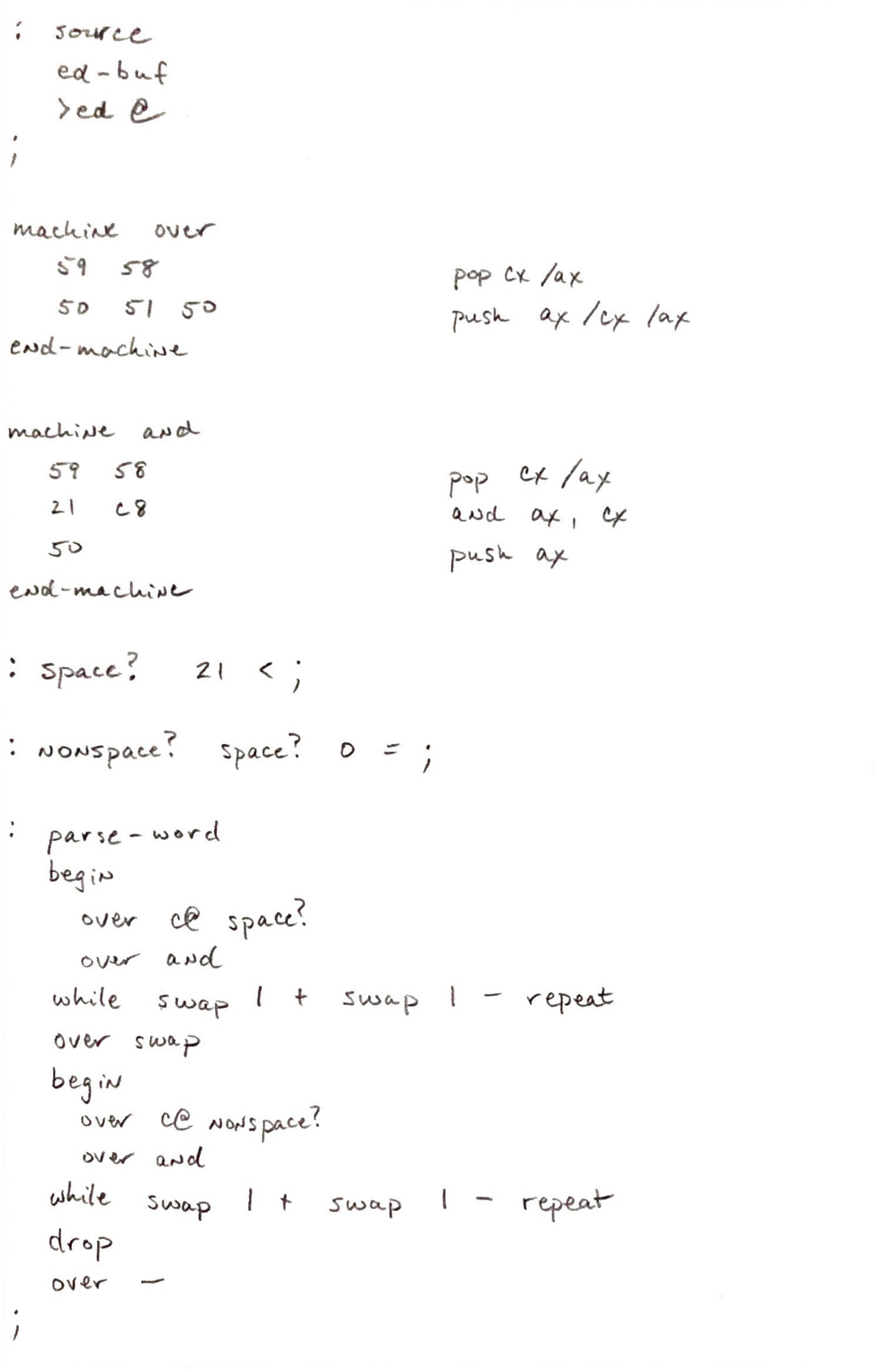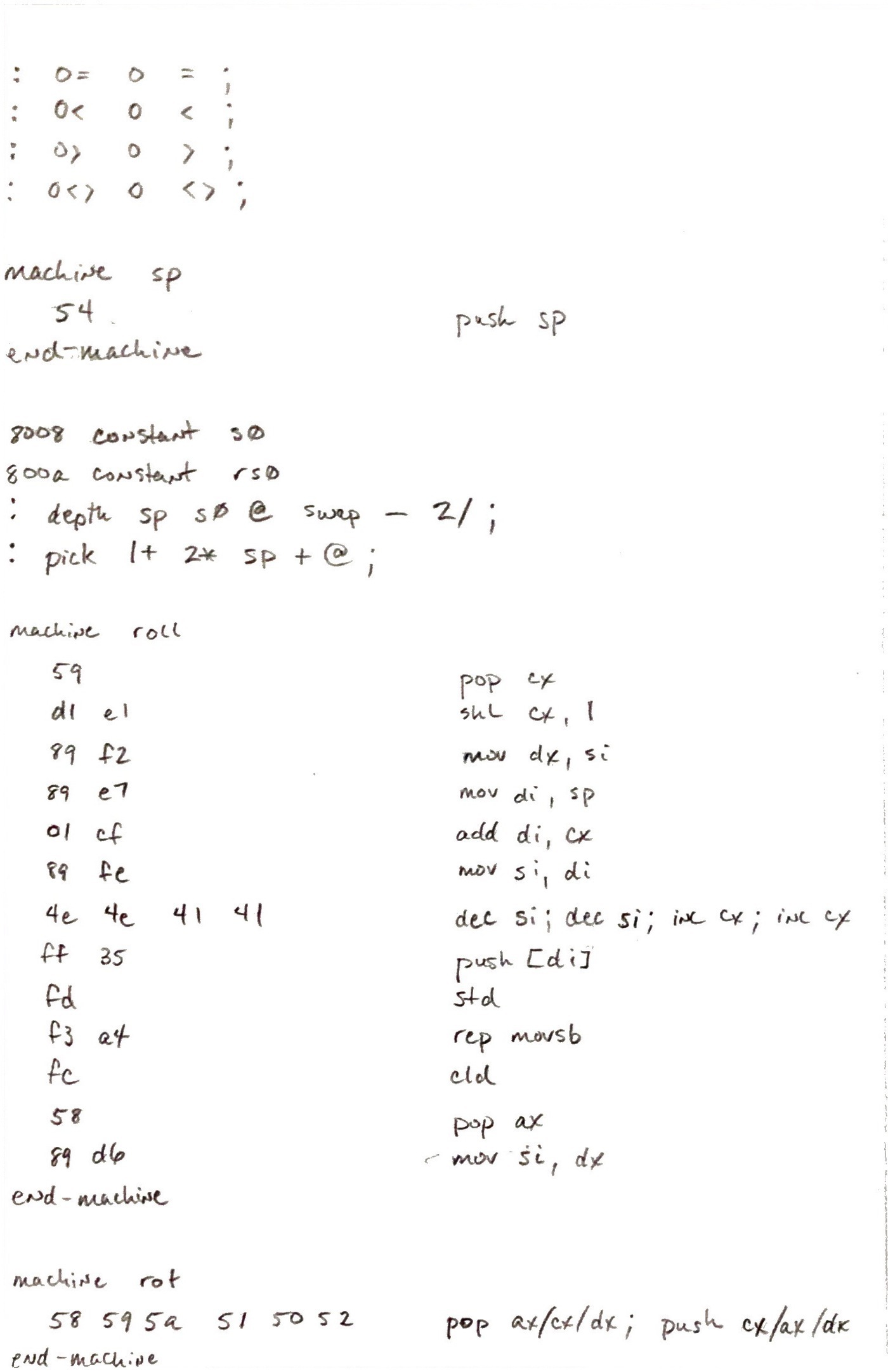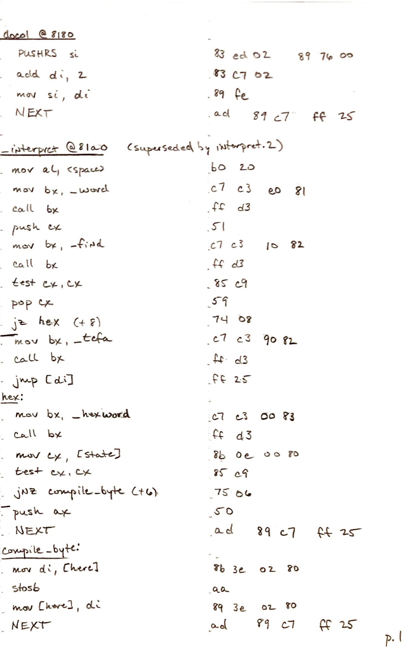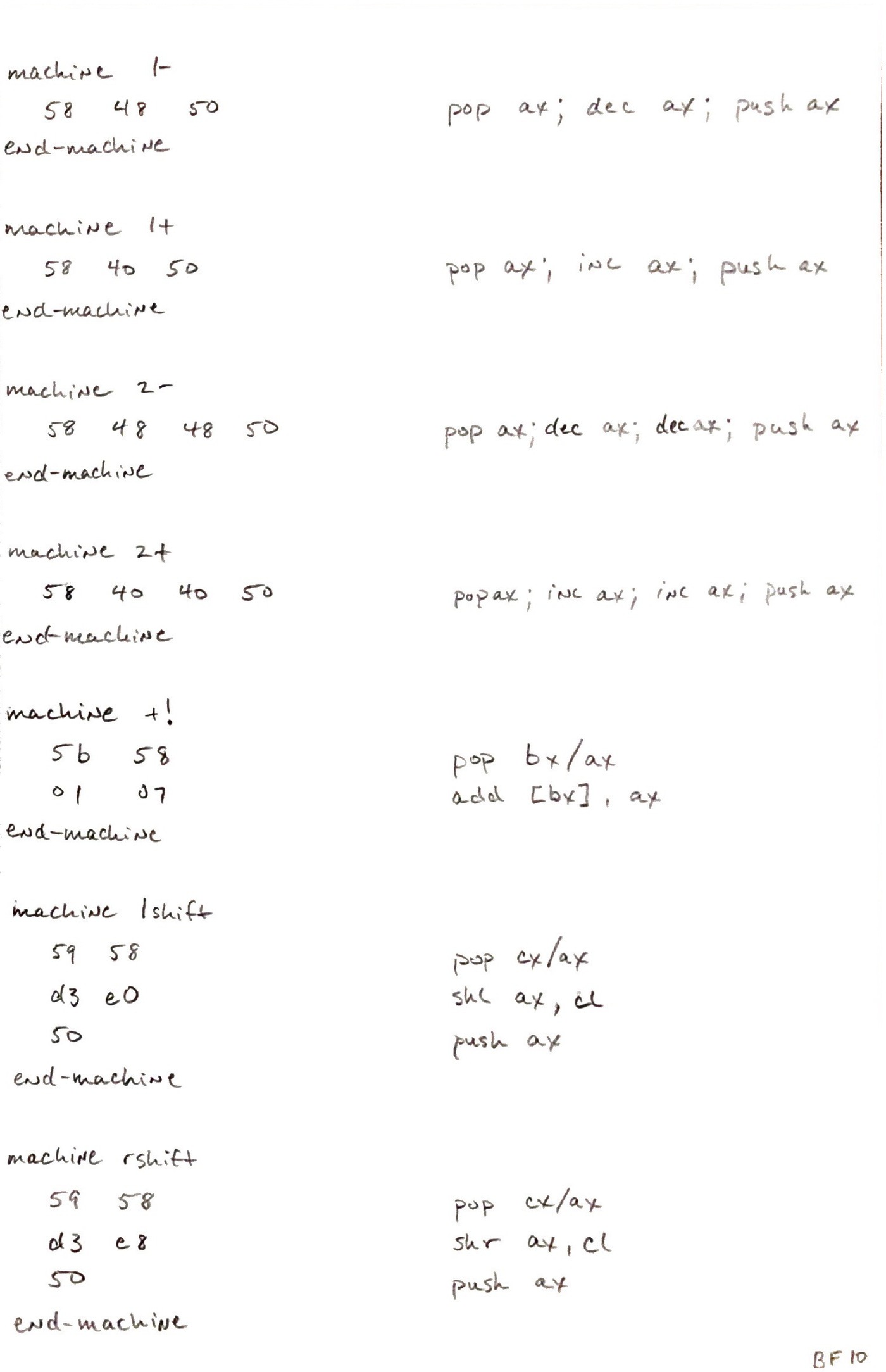 Writing out assembly by hand, translating it to hex, and keying it without mistakes is tedious and awful. So, as soon as possible, it would be nice to work at a higher level of abstraction. FORTH is a good candidate for several reasons: it's easy to parse, straighforward to bridge with native code, and—crucially—suitable for bootstrapping itself.