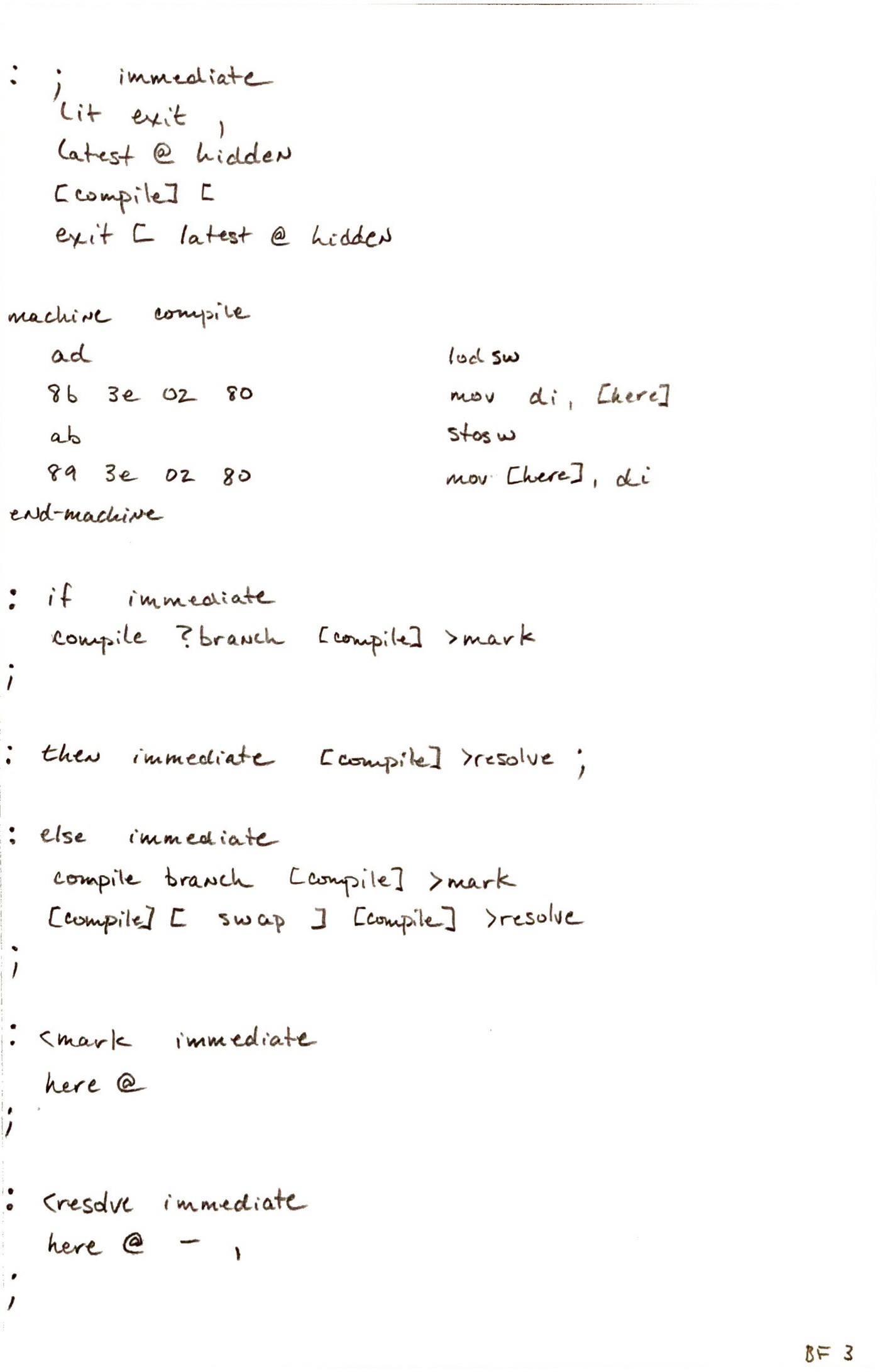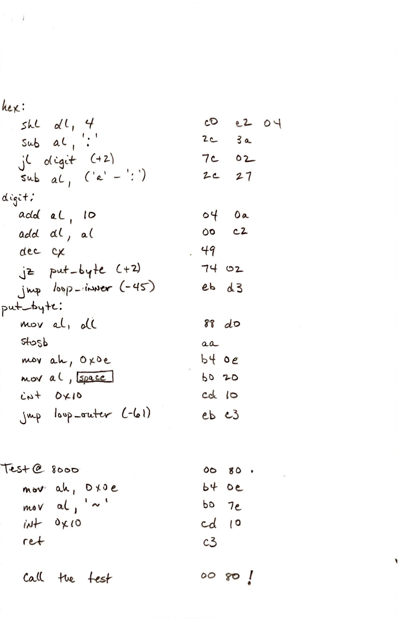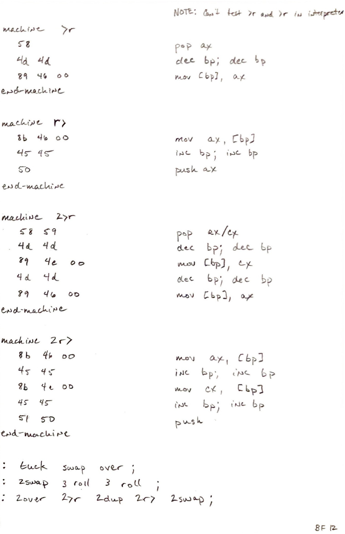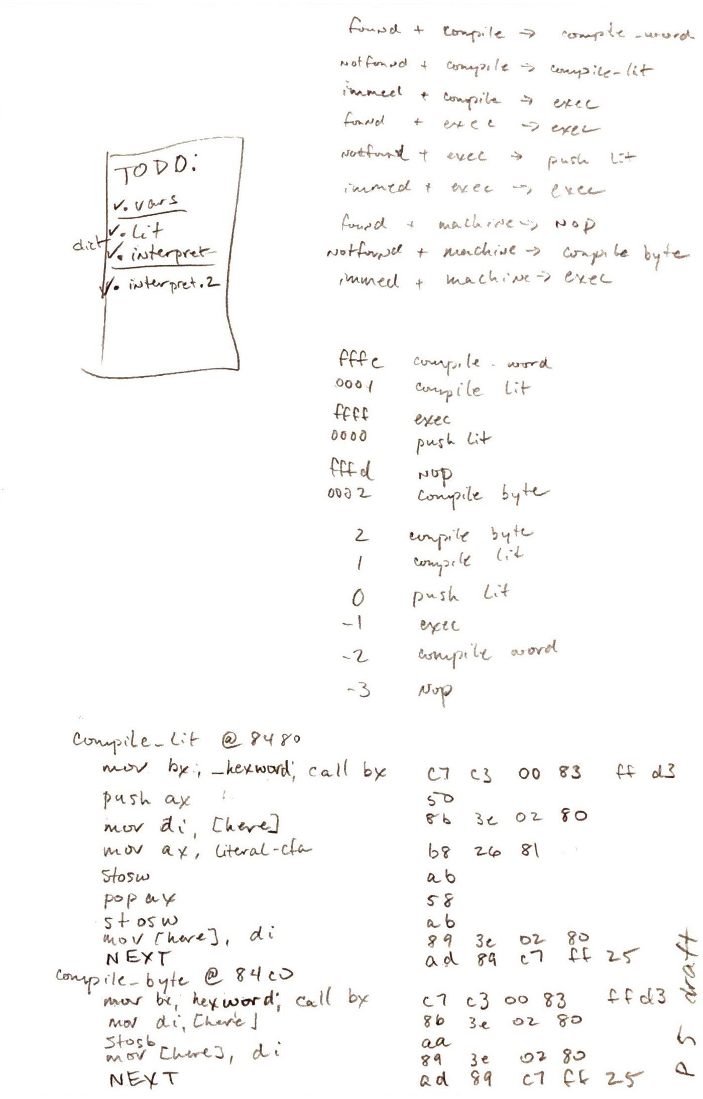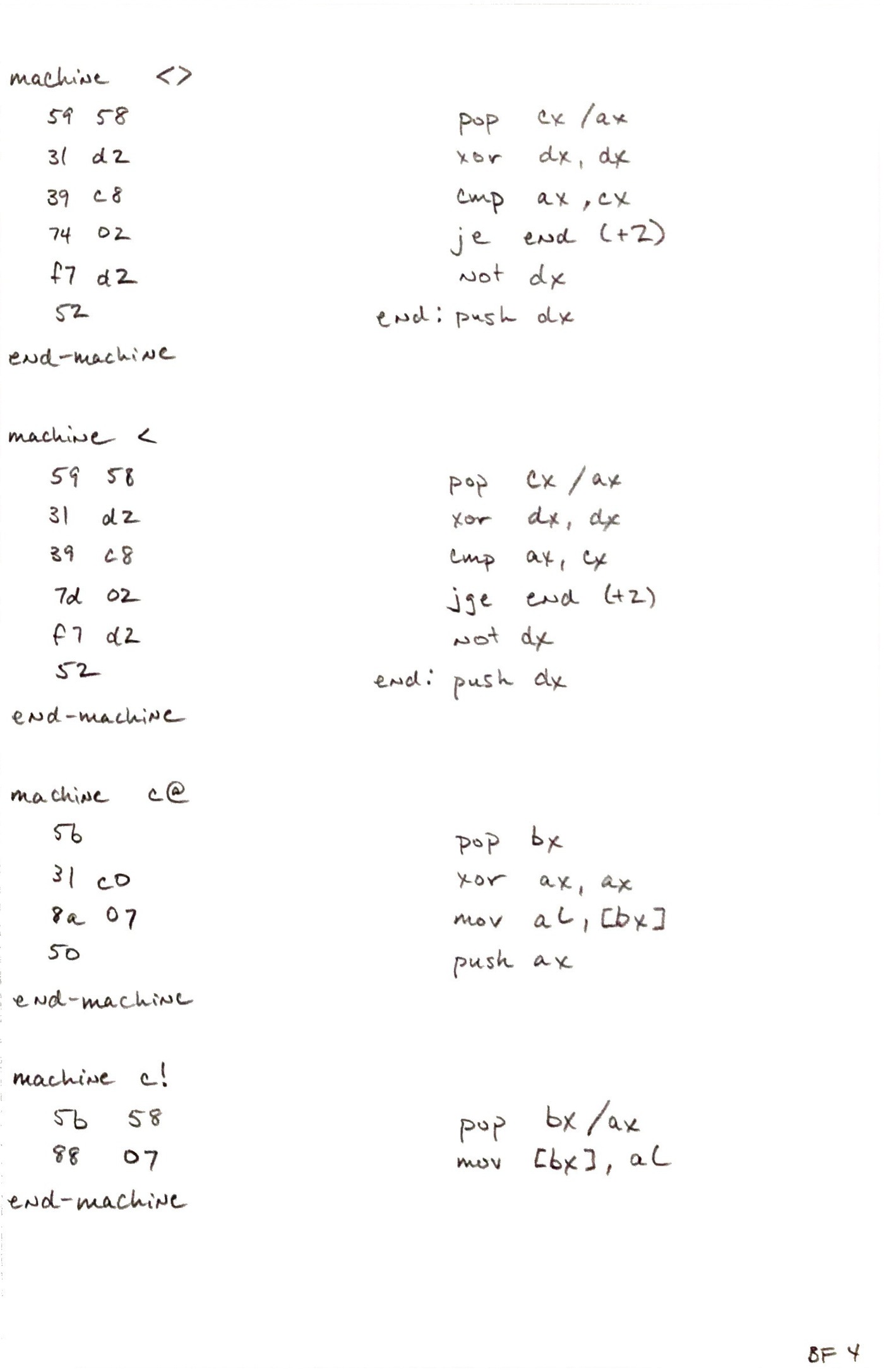 Writing out assembly by hand, translating it to hex, and keying it without mistakes is tedious and awful. So, as soon as possible, it would be nice to work at a higher level of abstraction. FORTH is a good candidate for several reasons: it's easy to parse, straighforward to bridge with native code, and—crucially—suitable for bootstrapping itself.