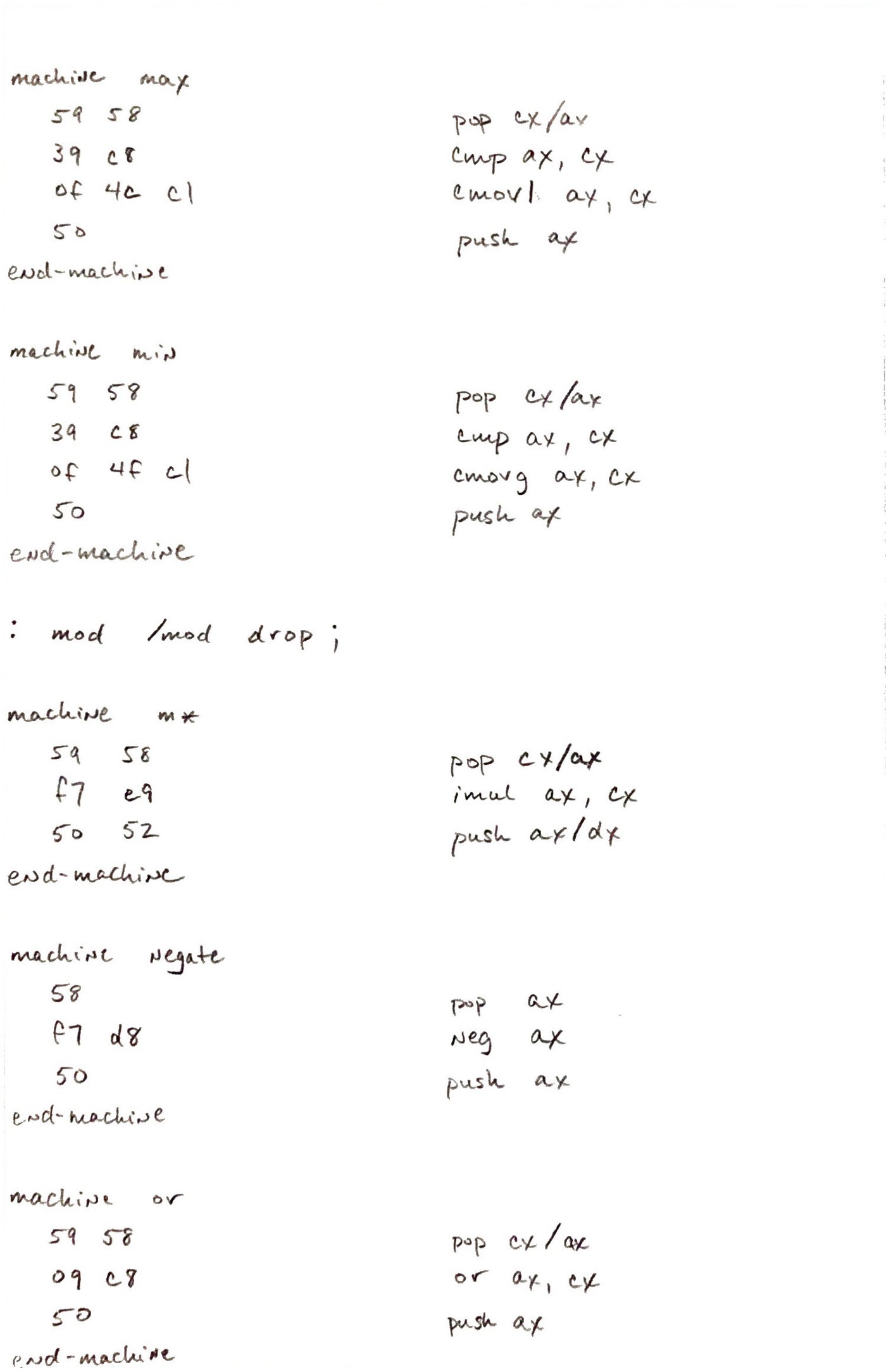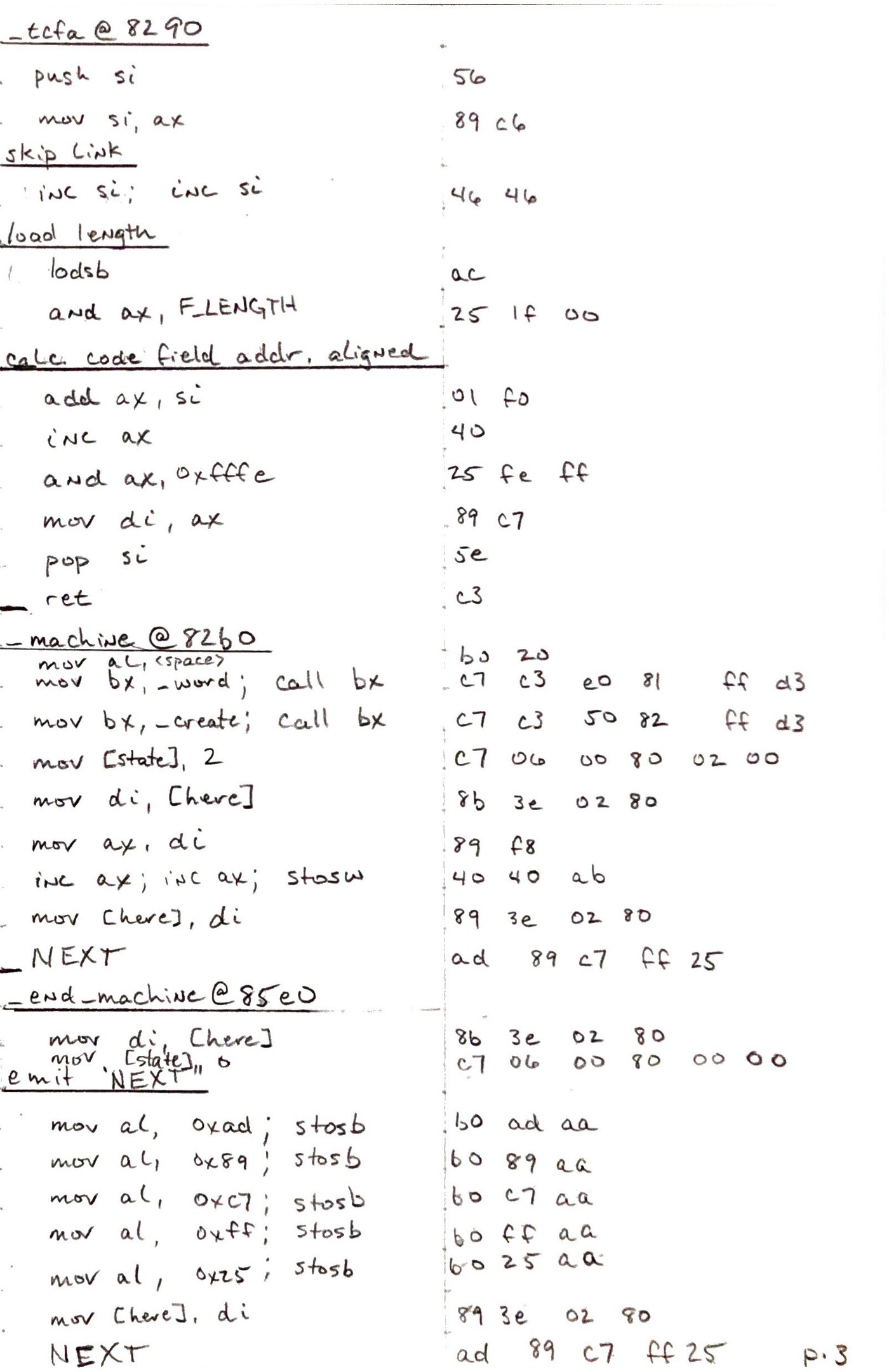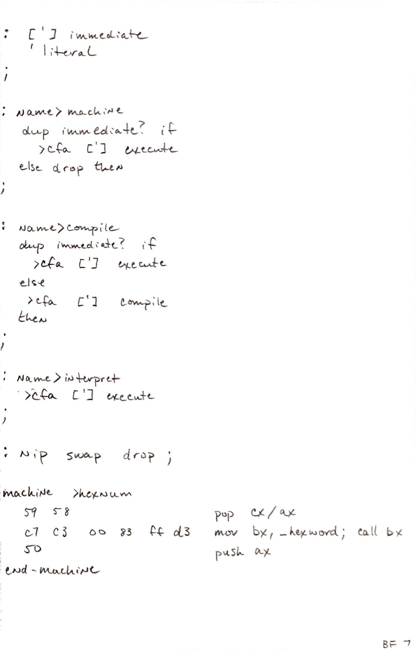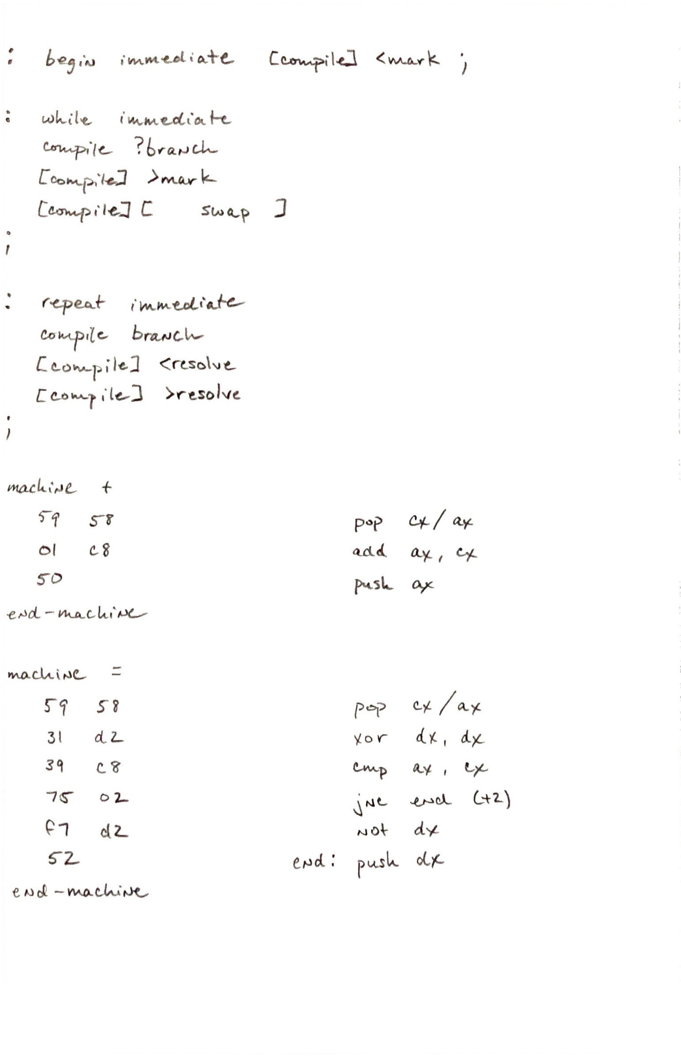 Writing out assembly by hand, translating it to hex, and keying it without mistakes is tedious and awful. So, as soon as possible, it would be nice to work at a higher level of abstraction. FORTH is a good candidate for several reasons: it's easy to parse, straighforward to bridge with native code, and—crucially—suitable for bootstrapping itself.