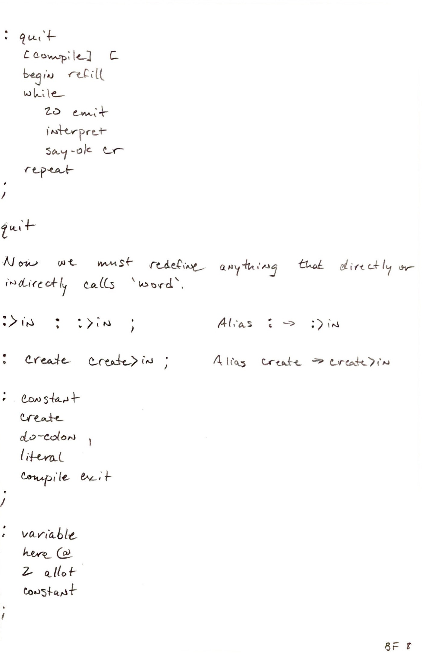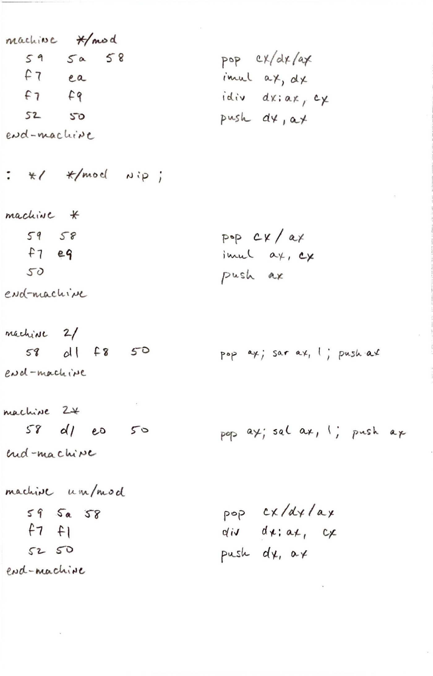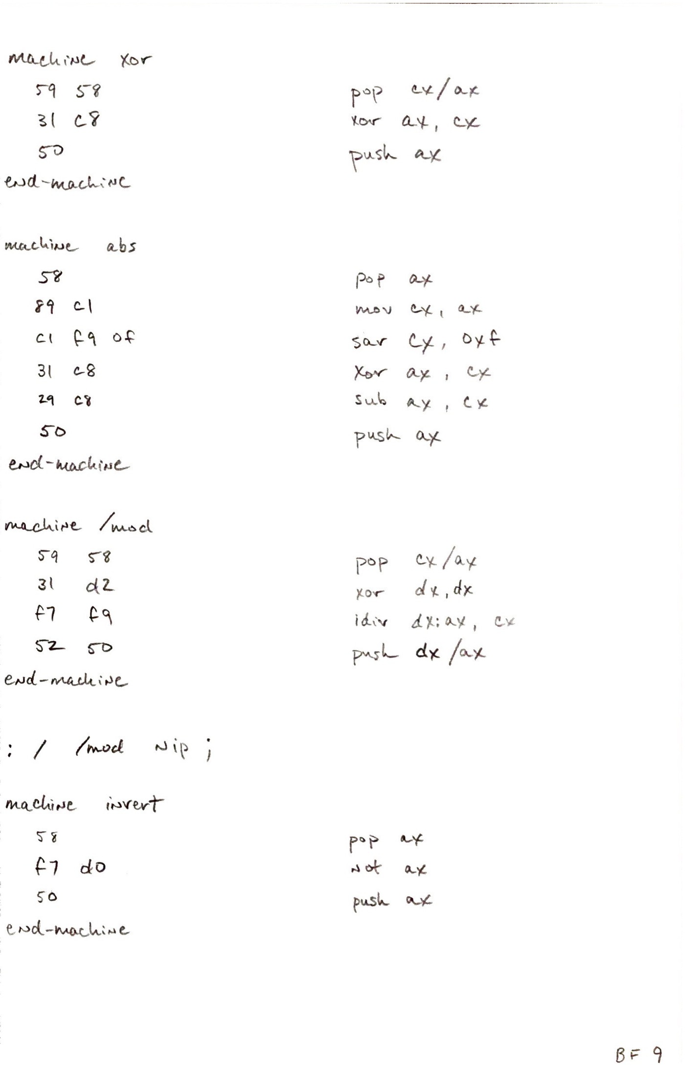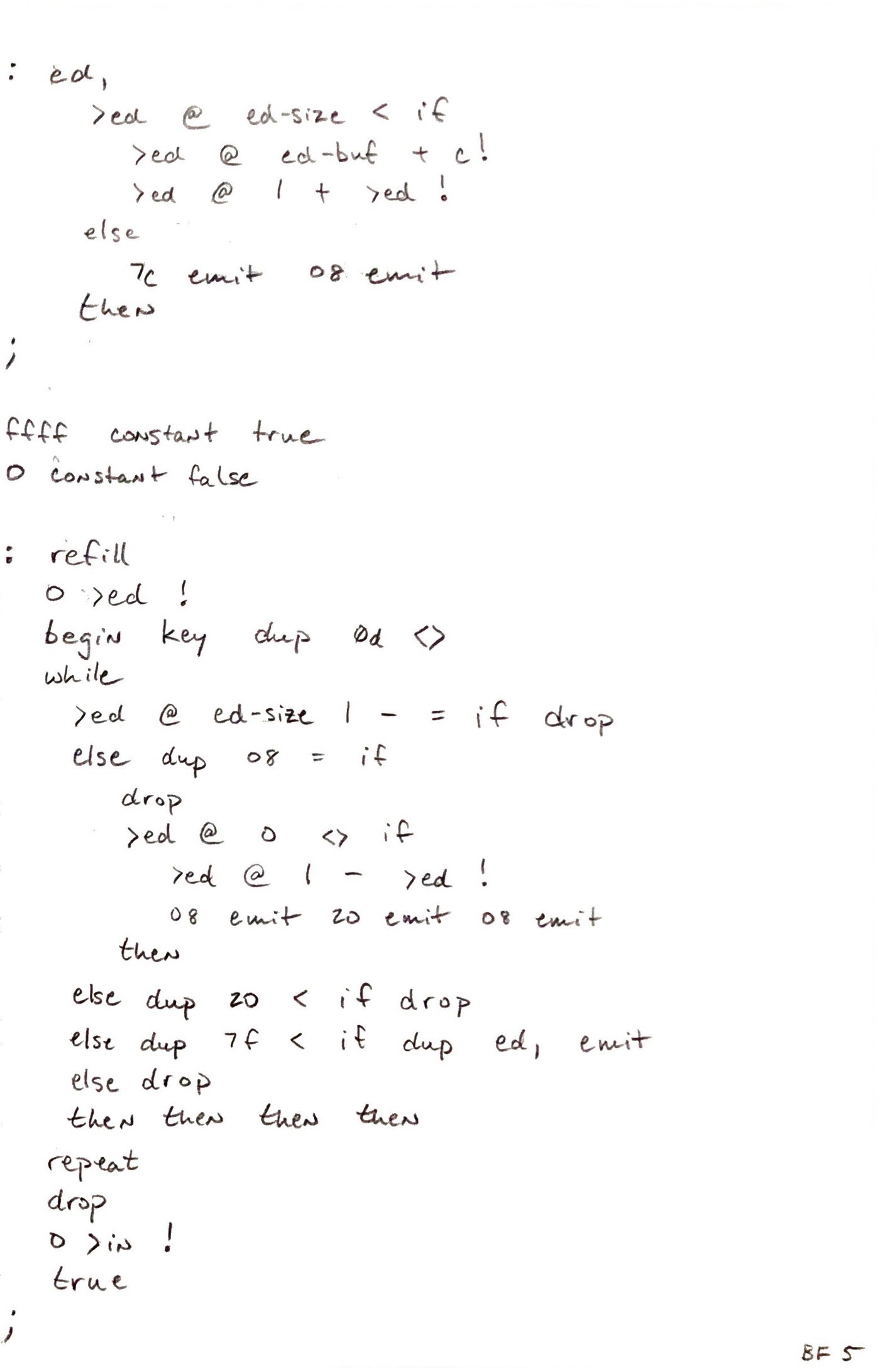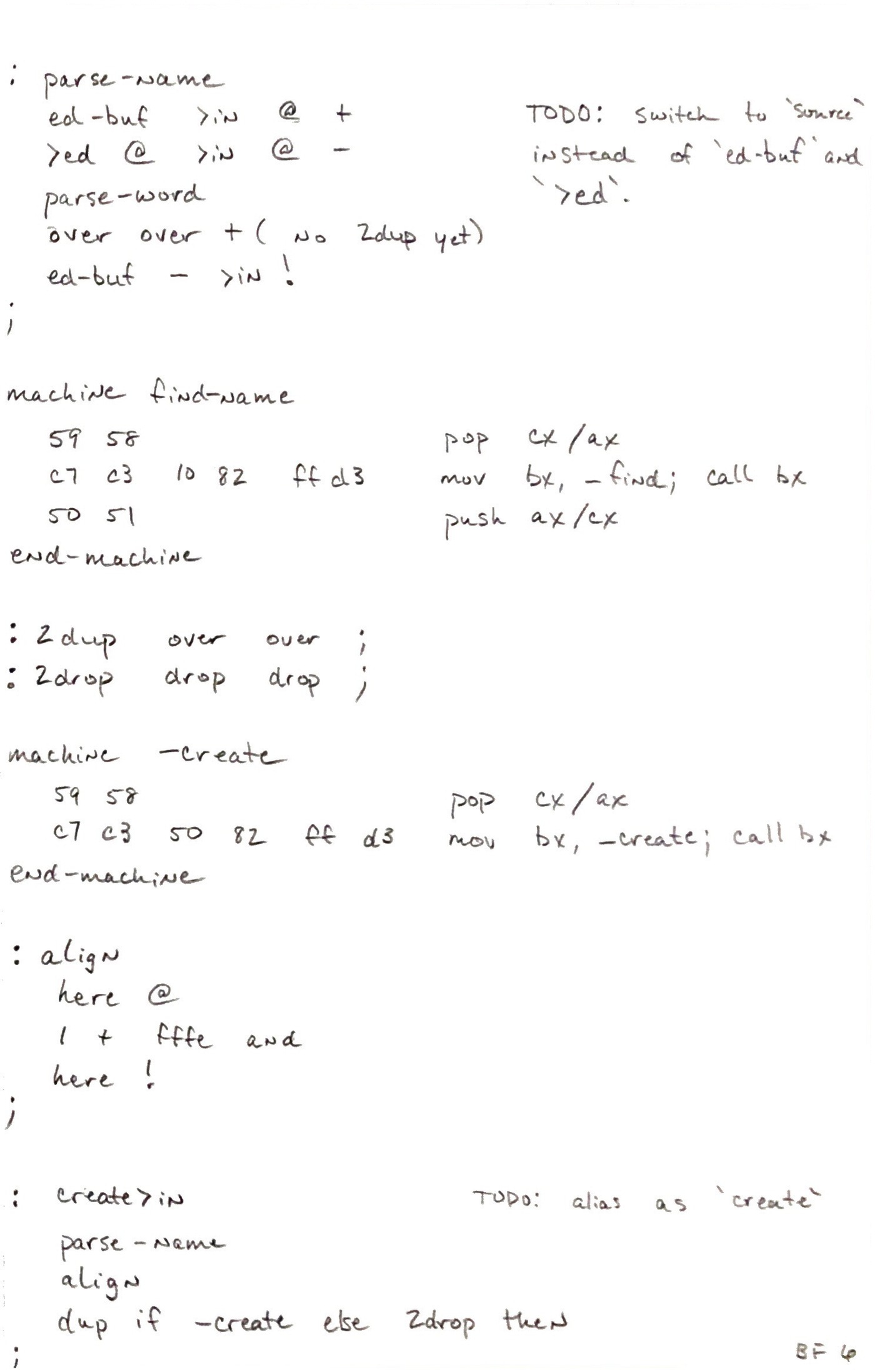 Writing out assembly by hand, translating it to hex, and keying it without mistakes is tedious and awful. So, as soon as possible, it would be nice to work at a higher level of abstraction. FORTH is a good candidate for several reasons: it's easy to parse, straighforward to bridge with native code, and—crucially—suitable for bootstrapping itself.