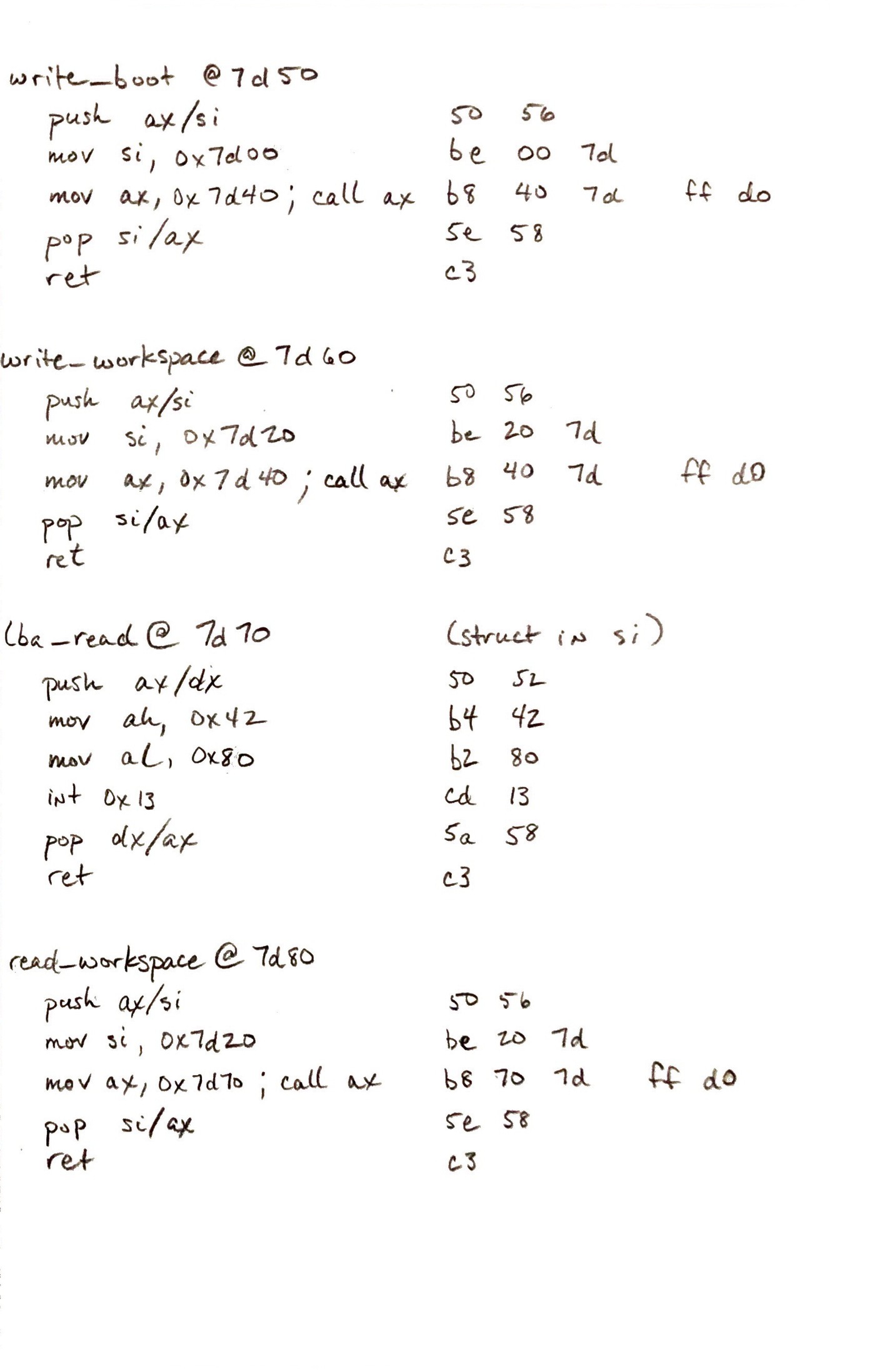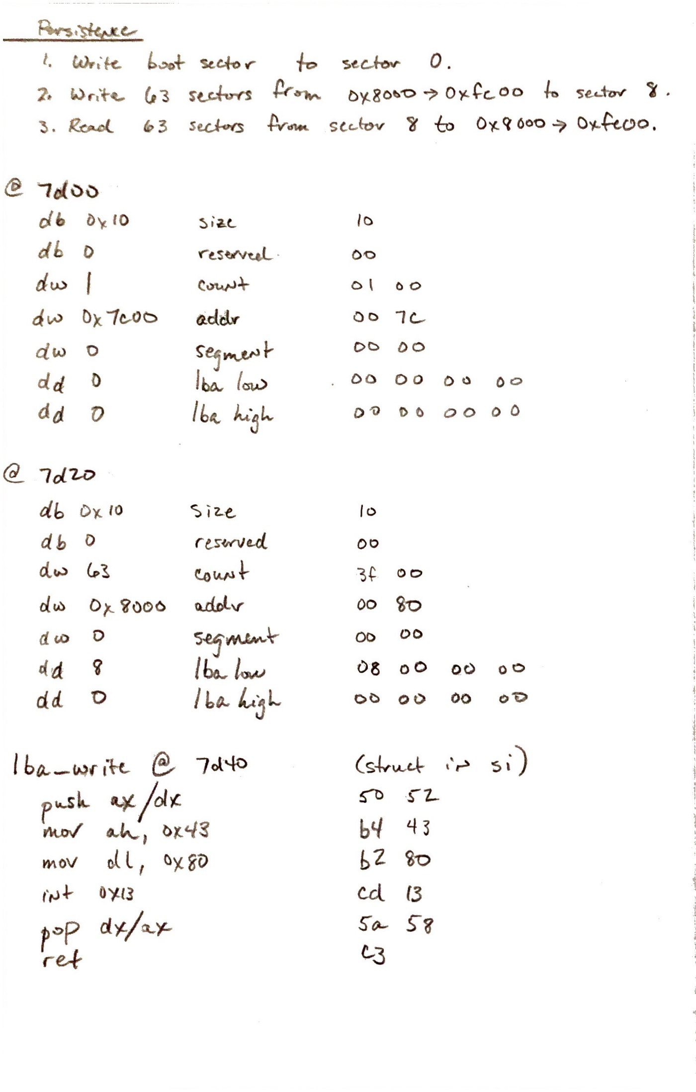 One important thing to note is that these functions are all defined in the memory occupied by the boot sector. It is dangerous to rewrite the boot sector, but it's important for these persistence functions. We need them to be available at boot so they can be used to load everything else.