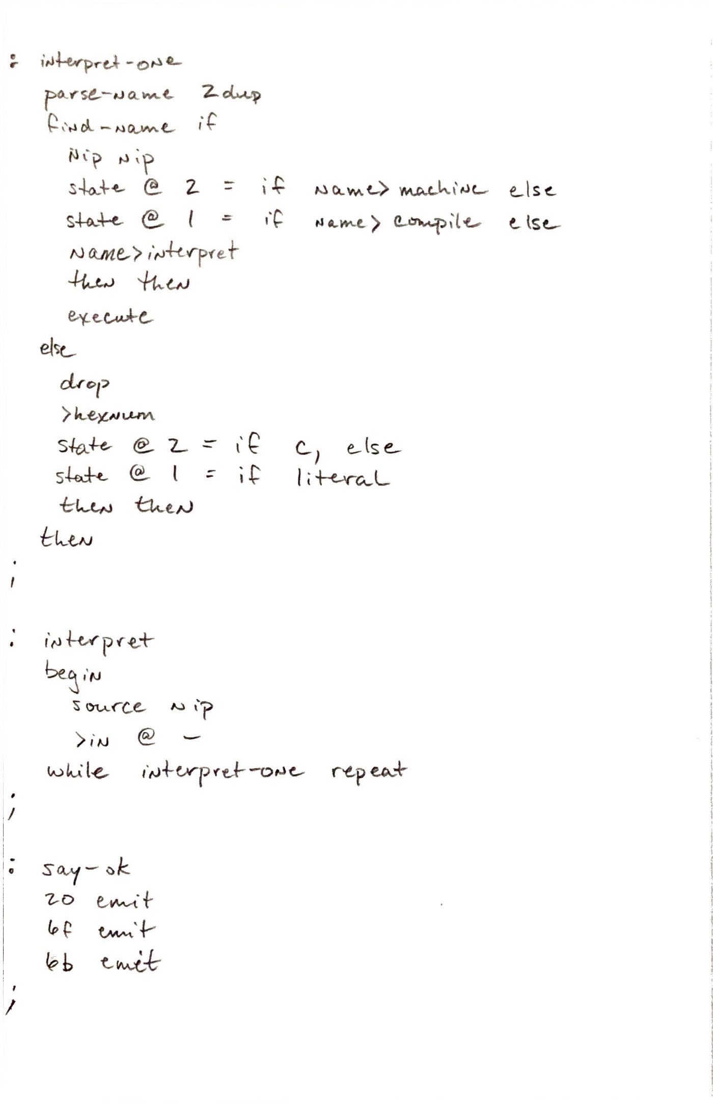 This first implementation of FORTH is as simple as possible, and consists only of six global variables, six dictionary entries, and a dozen or so functions to implement the interpreter.